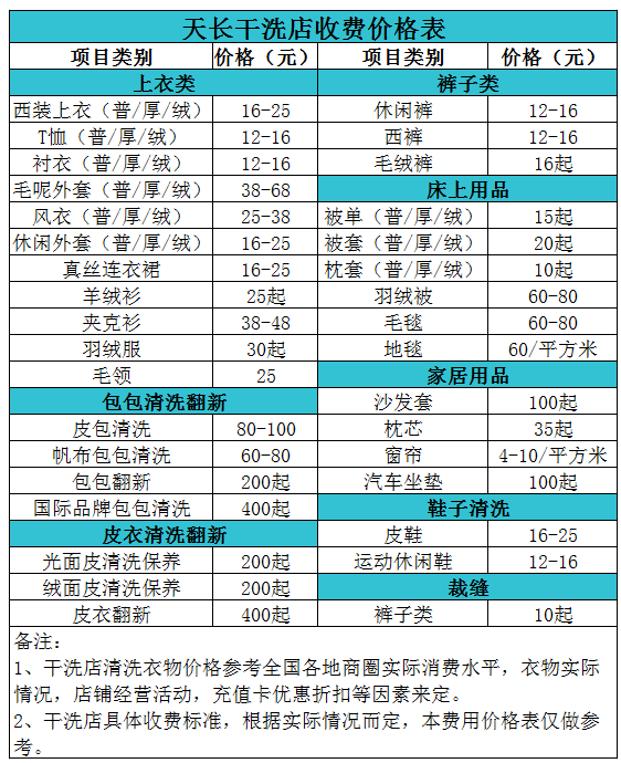 界首干洗店收費價格表【詳細收費標準】怎么收費更賺錢