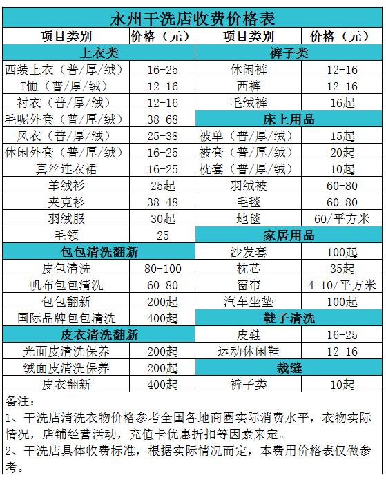 永州干洗店收費價格表【詳細收費標準】怎么收費更賺錢