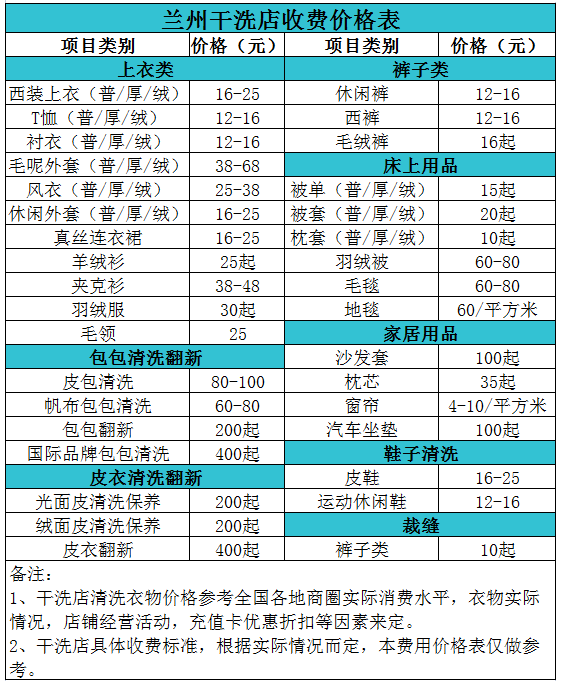 蘭州干洗店收費價格表【詳細收費標準】怎么收費更賺錢